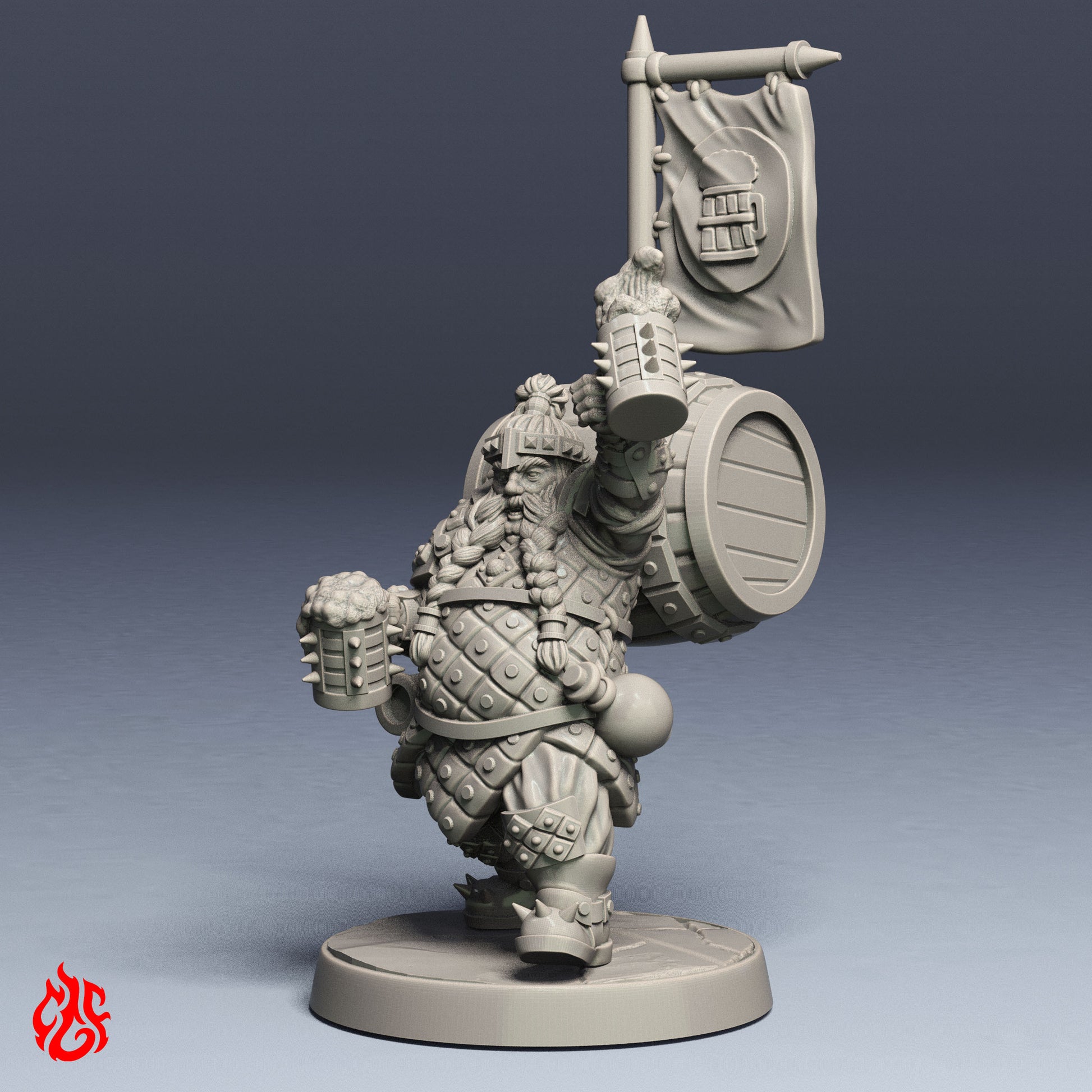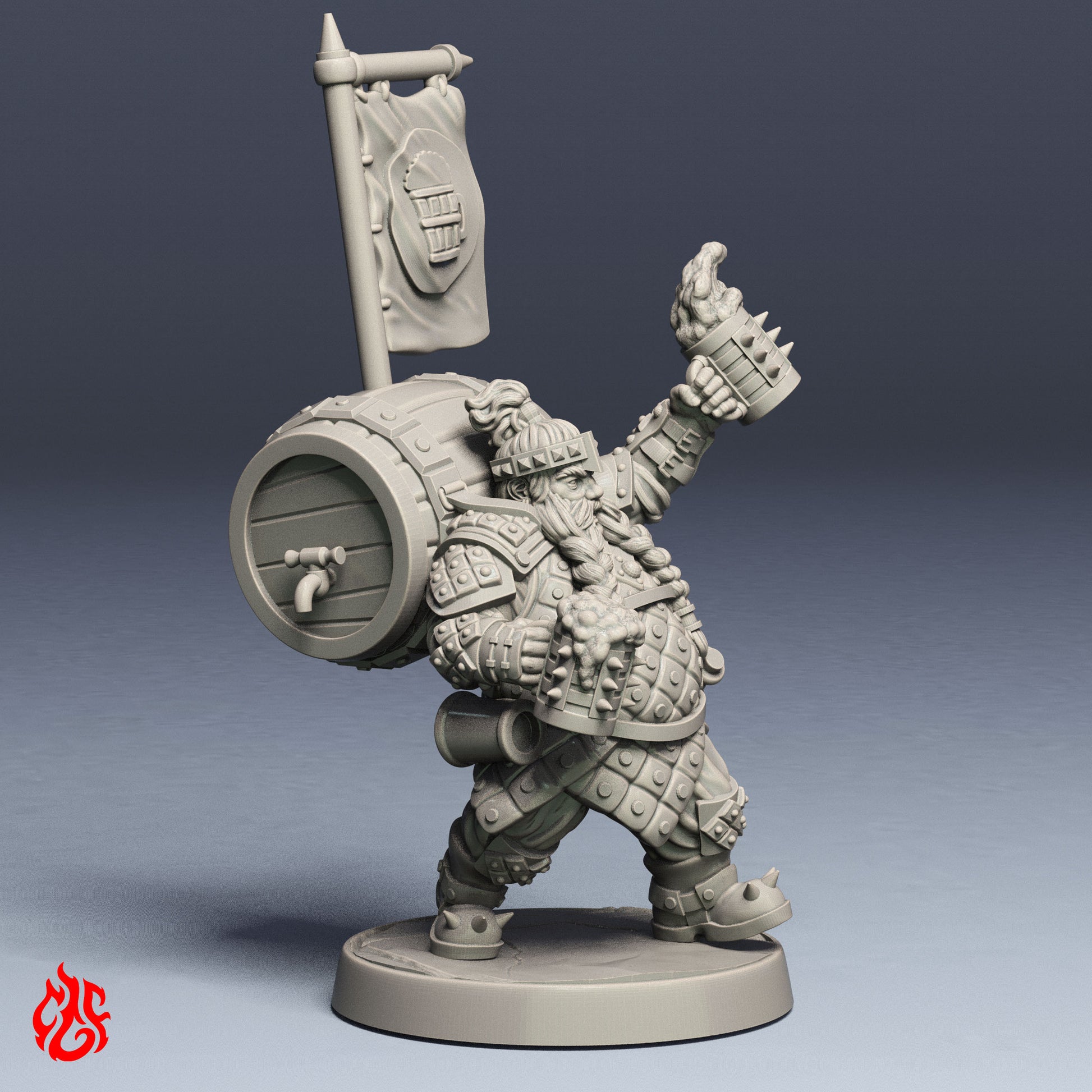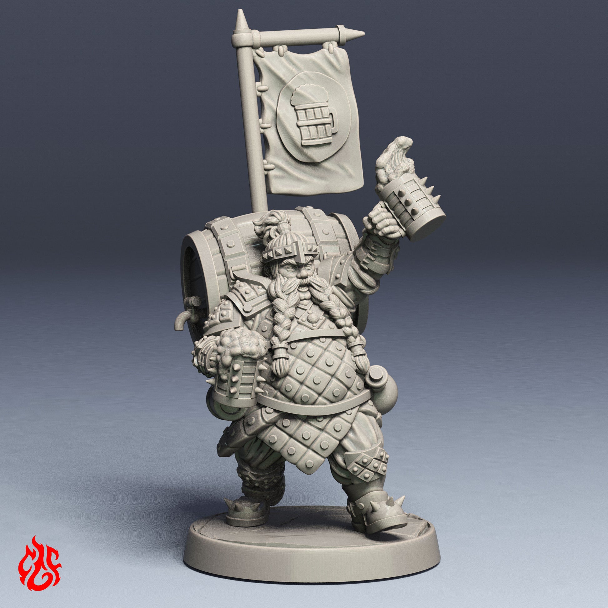 El Portaestandarte es especialista en combate de apoyo y experto cervecero a la vez. Ataviado con una armadura ligera, sirve como indicador de la posición del escuadrón durante las operaciones militares. La bandera de colores facilita la orientación entre los soldados circundantes. Guantes reforzados y jarras de hierro con tachuelas le permiten defenderse a sí mismo y a su preciado cargamento. Siempre lleva su barril lleno de todo tipo de cervezas, lo que le permite apoyar a sus camaradas de diversas maneras.